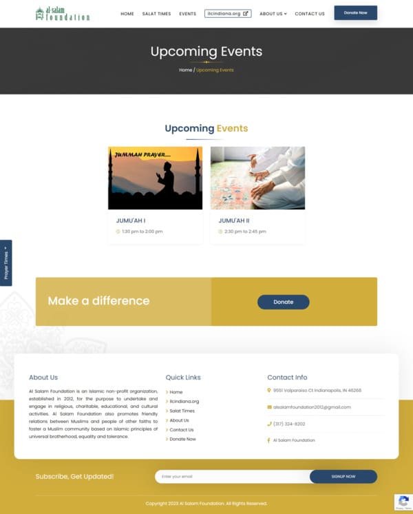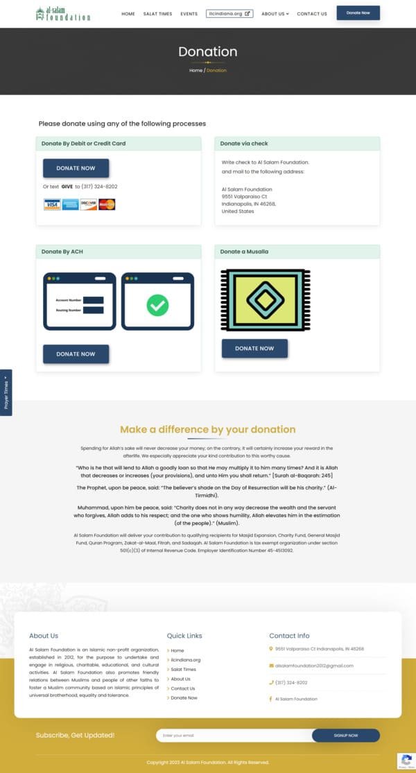 Masjid Solutions provided Al Salam Foundation with a comprehensive donation management system, including a KIOSK, to facilitate easy and secure donations. Masjid Solutions developed a user-friendly web interface that enables people to donate from the website through a dedicated donation page on the site. The system was designed with robust security measures and user data protection features to ensure the safety of sensitive information.