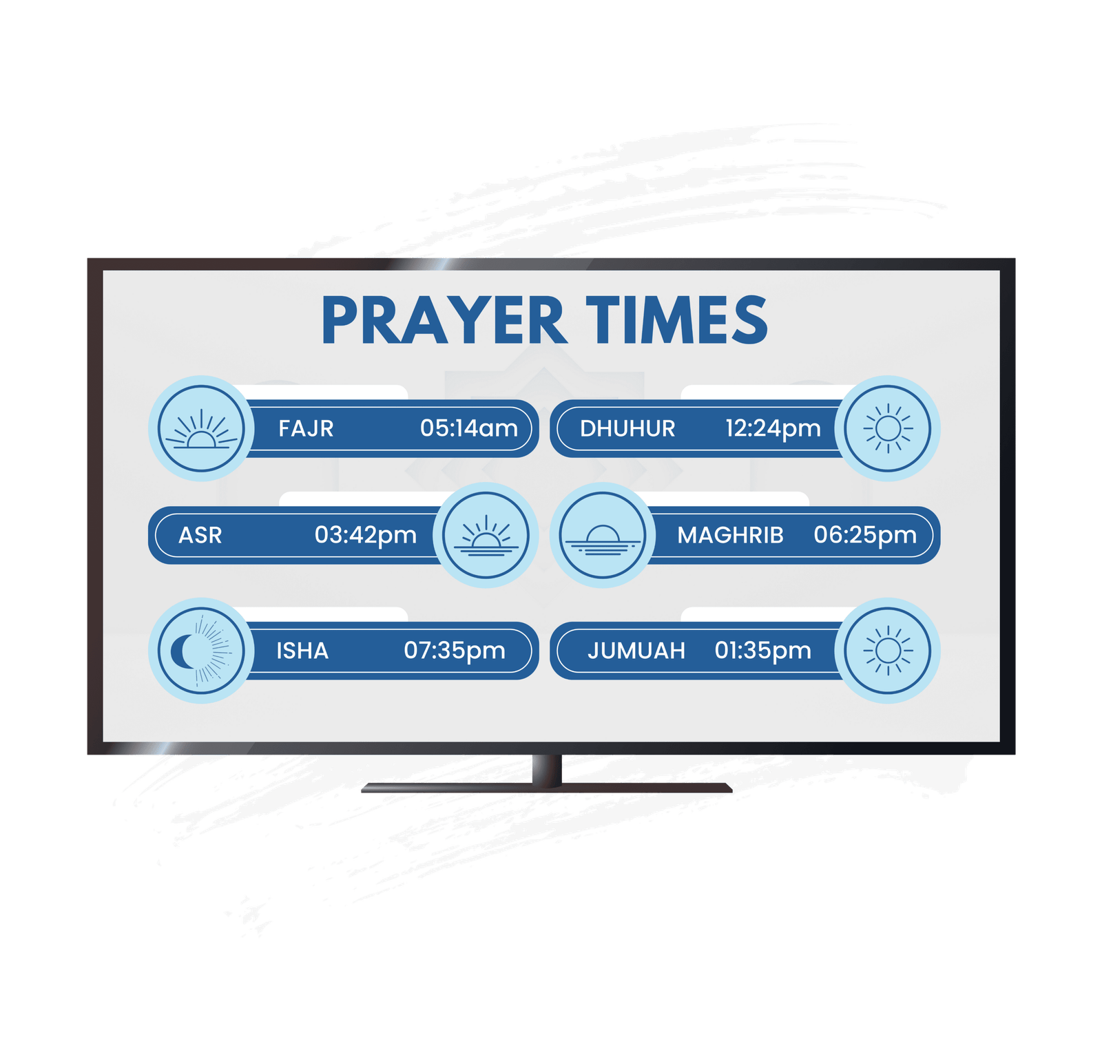 Masjid Solutions showcases a cutting-edge digital signage system that remotely controls prayer times, iqamah, event announcements on mosque displays. This system allows for real-time updates of prayer schedules and events, ensuring smooth communication across the mosque. With its easy-to-manage interface, the Masjid Digital Signage keeps the community connected and informed.